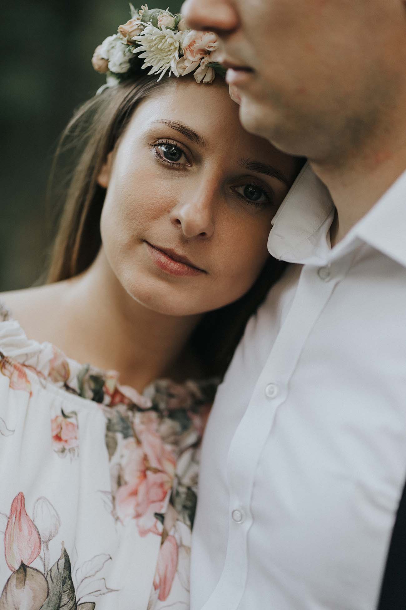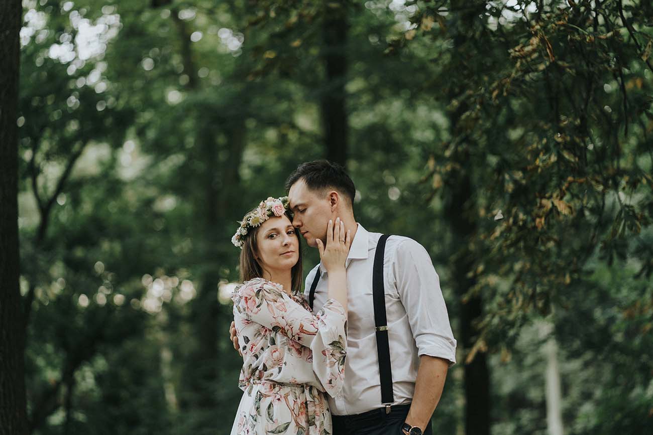 Ola założyła piękną, zwiewną sukienkę, która przepięknie komponowała się z wiankiem we włosach, a Darek ubrał się elegancko w białą koszulę, ciemne spodnie i szelki. Sesja rozpoczęła się od spaceru po malowniczym Parku Bednarskiego. Tam znaleźliśmy uroczy kącik, w którym magicznie wpadało światło zachodzącego słońca. Po kilkudziesięciu minutach przeszliśmy w bardziej zielone i zacienione miejsce. Tam wykonaliśmy wiele zdjęć podczas przytulenia, uwieczniając również pocałunki.